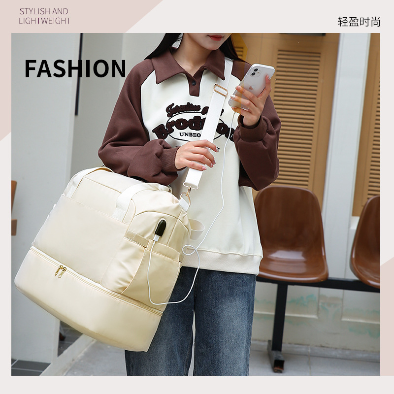 >> 跨境定制logo健身包大容量斜跨包女士瑜伽包干湿分离带鞋位USB