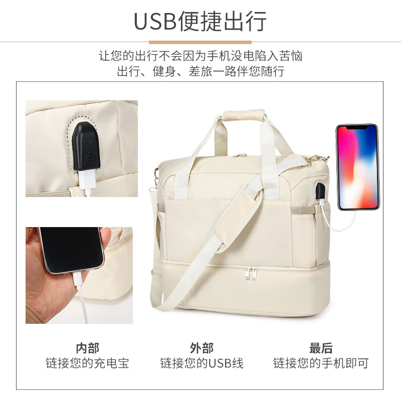 >> 跨境定制logo健身包大容量斜跨包女士瑜伽包干湿分离带鞋位USB
